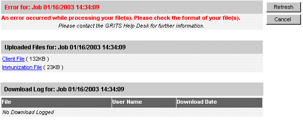 This following screen indicates the data exchange request could not be processed due to formatting errors in the data file(s) you have uploaded. GRITS provides links to the original file(s) you submitted, so you can view, download, fix and resubmit the data exchange request.